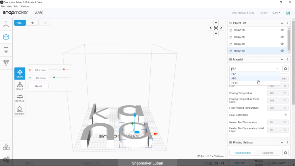 As long as your heated bed is large enough, you can print multiple letters at a time. Import the model files you just exported and generate one single G-code file. Arrange the letters as shown in the video and change the settings under “Material” for PETG accordingly.