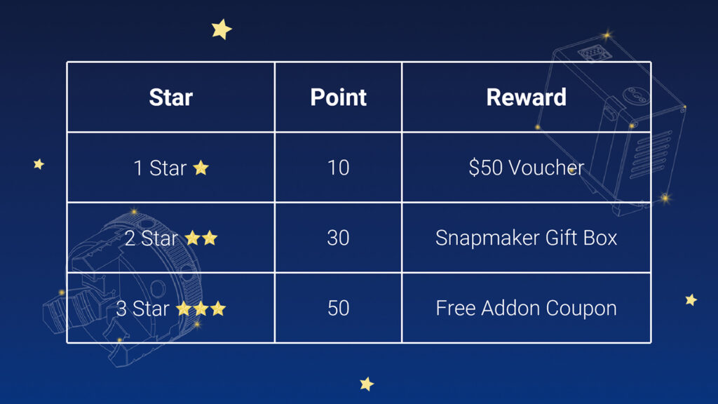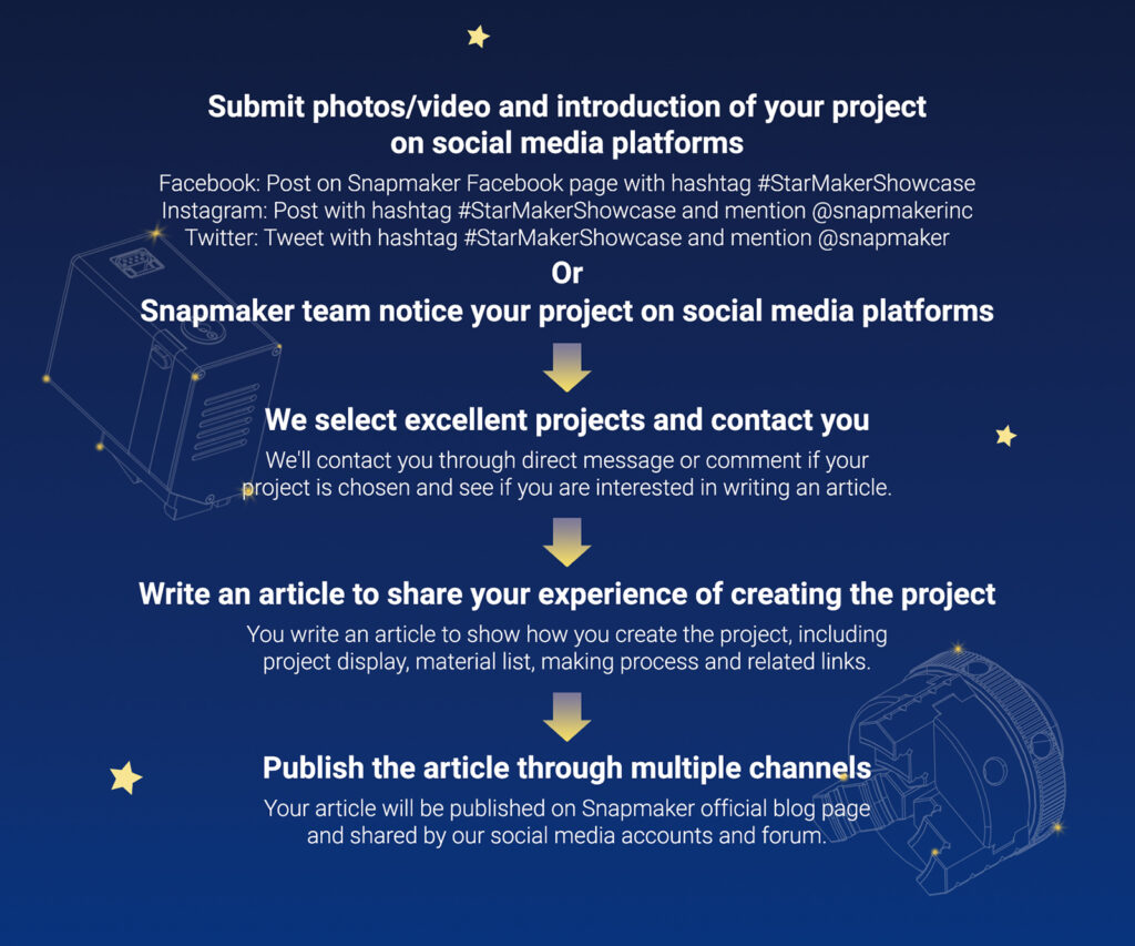 StarMaker Program is a series of long-term plans aiming at stimulating the communication within our community as well as the connection between users and the Snapmaker team. Leading users who contribute to skills teaching, inspiration sharing, product feedback and community maintenance will be awarded star honor and other rewards.